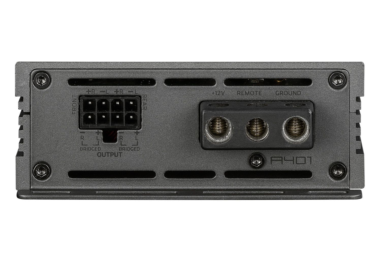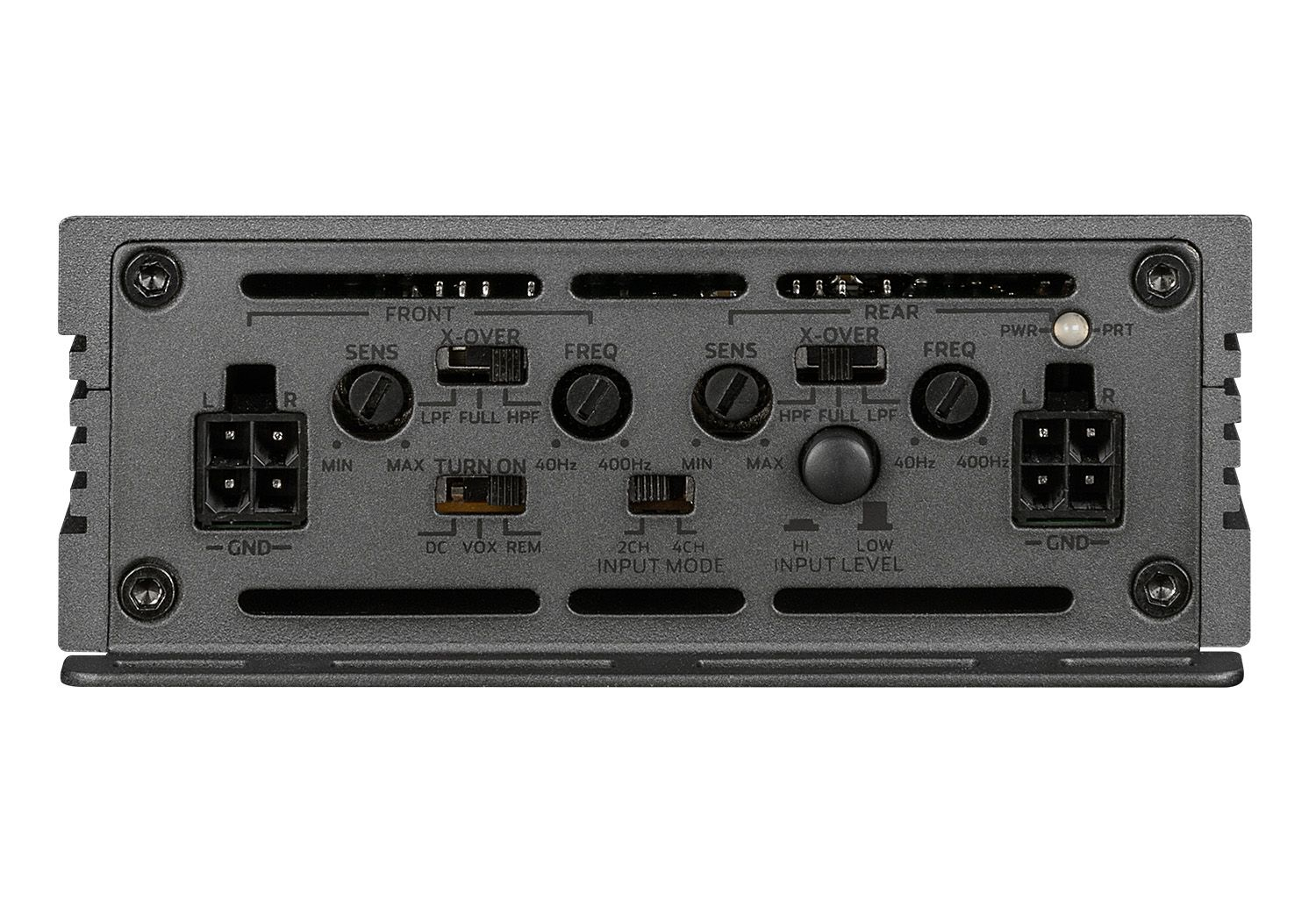 Crossover-urile electronice integrate cu 12 dB/Oct fiecare. Frecventa in raspuns variabila de la 40 la 400 Hz si poate fi comutata ca filtru de trecere inalta sau de trecere joasa. In plus, exista intrari de nivel inalt cu functie de pornire automata pentru conectarea la radiourile originale fara iesire RCA-acest lucru care faciliteaza combinarea amplificatorului cu radiourile instalate din fabrica.