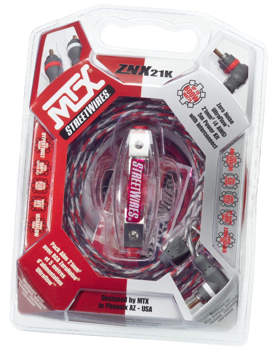 Pachetul de alimentare MTX ZNX21K 21mm2 4 AWG este conceput pentru sisteme cu o putere totală de până la 800W RMS. Este, de asemenea, foarte complet: 5 metri de alimentare, 70 cm de cablu de împământare, un cablu audio RCA HyperTwist® UltraFlex™ Technologies 100% cupru cu construcție simetrică anti-zgomot, un suport de siguranțe AFS înșurubat cu două siguranțe, 5 metri de cablu de telecomandă și toate accesoriile mici. Este potrivit pentru sisteme cu o putere totală de până la 800W RMS.