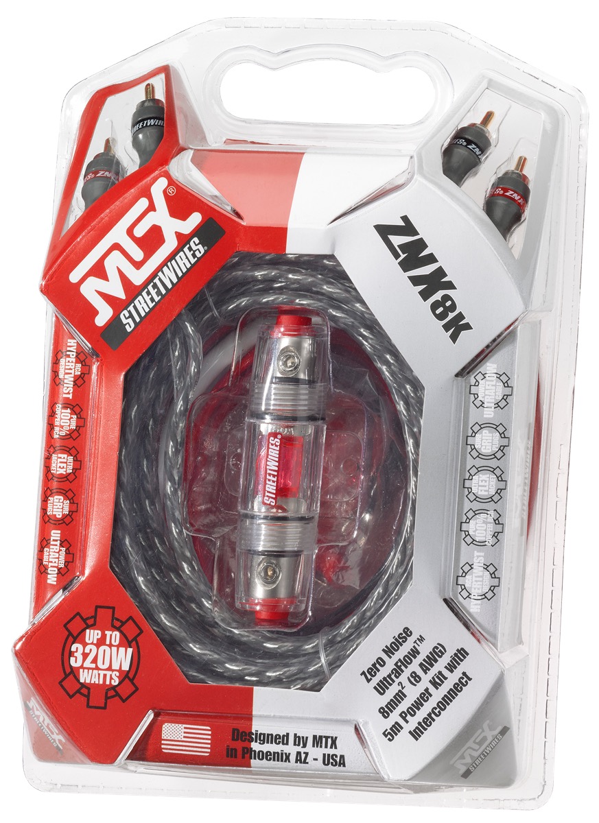 Pachetul de alimentare MTX ZNX8K 8mm2 8 AWG este conceput pentru sisteme cu o putere totală de până la 320W RMS. Este, de asemenea, foarte complet: 5 metri de alimentare, 70 cm de cablu de împământare, un cablu audio RCA HyperTwist® UltraFlex™ Technologies 100% cupru cu construcție simetrică anti-zgomot, un suport de siguranțe AFS înșurubat cu două siguranțe, 5 metri de cablu de telecomandă și toate accesoriile mici. Este potrivit pentru sisteme cu o putere totală de până la 320W RMS.
