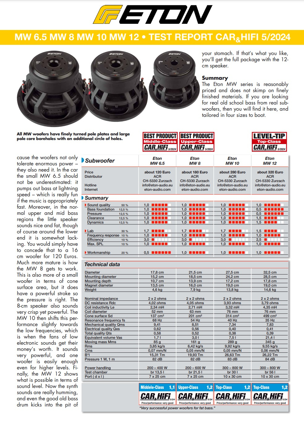 Noua serie de subwoofere Performance – MW! Putere maxima, lovituri dure ca stanca si bass profund. Dinamic cu niveluri extreme, pentru bas cu cel mai bun factor de distractie: Materiale dovedite de con si imprejurimi in cosuri din aluminiu turnat sub presiune ranforsat, acoperite cu pulbere, bobine duble de rezistenta si sisteme de magneti de ferita extrem de puternice asigura performanta extrema a basului la cel mai bun raport pret-performanta.